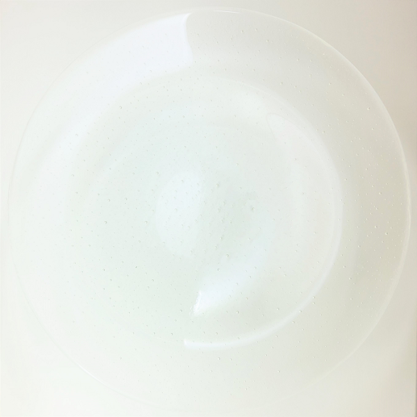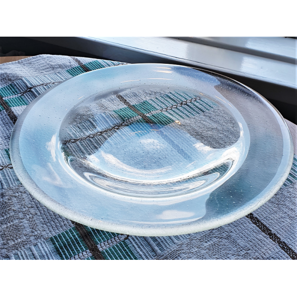 En djupare rund tallrik i transparent glas för användning av uppläggning eller mat.