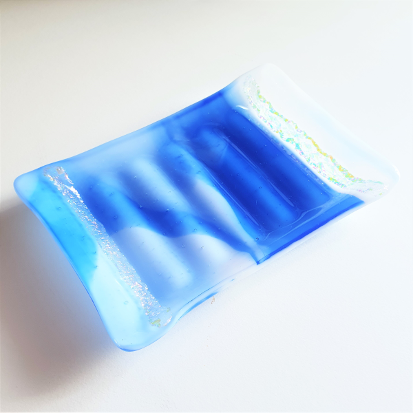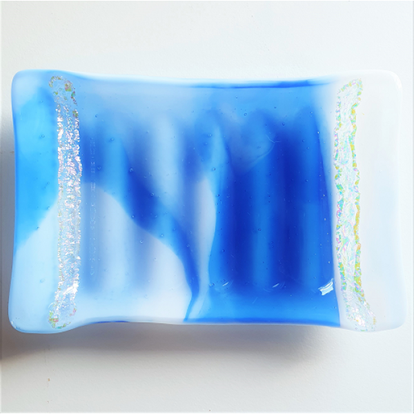Glasfusad tvålkopp i specialglas av blå färg med lite glittrande dichroic nära kanterna. Storleken på tvålkoppen är ca 15x10 cm och en höjd över bordet av ca 1,5 cm. Frakt adderas i kassan. Läs mer om leveranskostnader