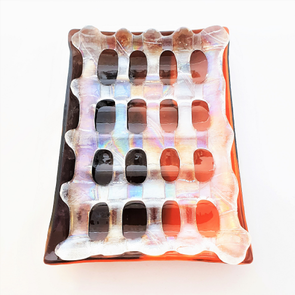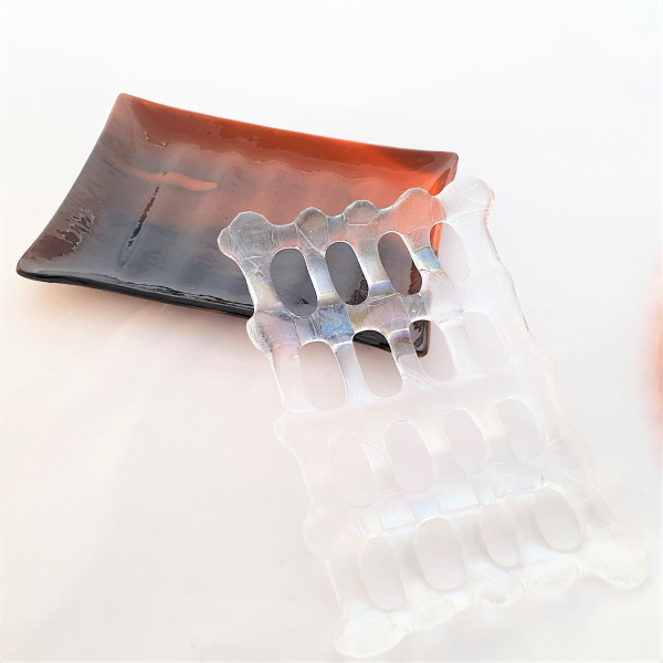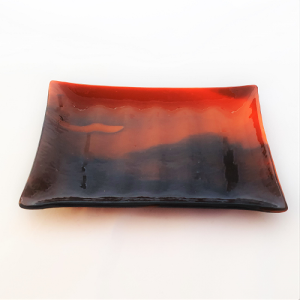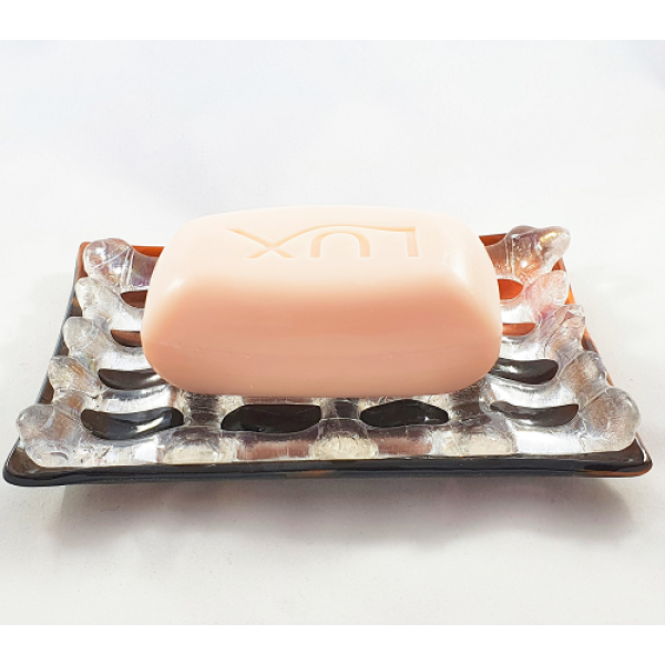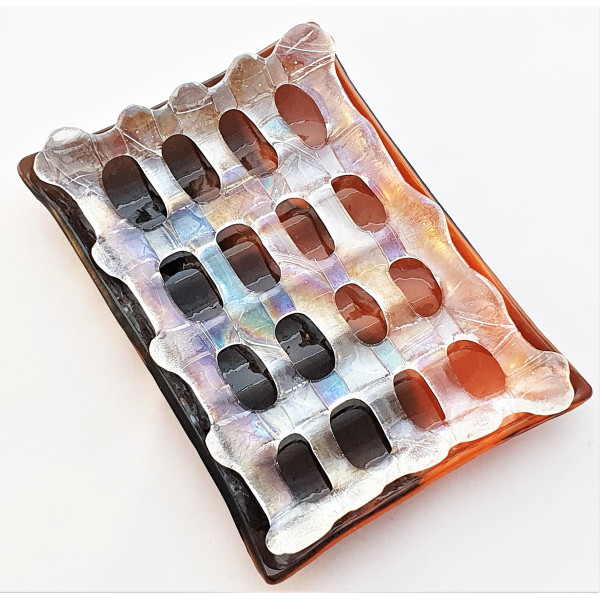 Glasfusad tvålkopp i två delar fusat i specialglas i varma färger och en topp i iridiserande transparent för lite glitter. En del läggs ovan den andra så att ev vatten rinner ner i tvålkoppen. Storleken på tvålkoppen är ca 14x10 cm och en höjd över bordet av ca 1,7 cm.