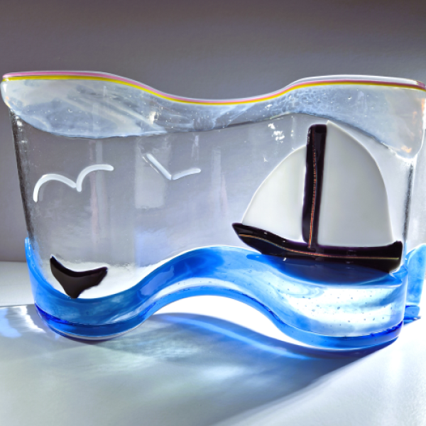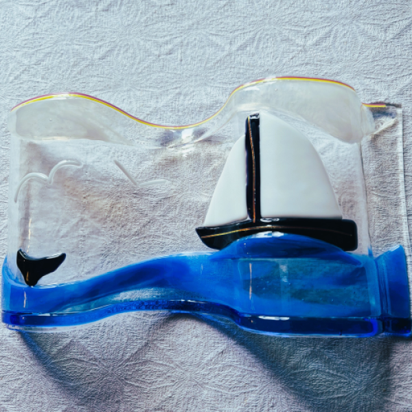 Transparent panel med en glasfusad segelbåt på havet som kan användas till bokhyllan eller som fönsterdekoration. Panelen är formad så att den kan stå på fönsterbrädan. Storleken är ca 26 x 15 cm med ett djup av ca 5 cm.