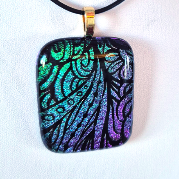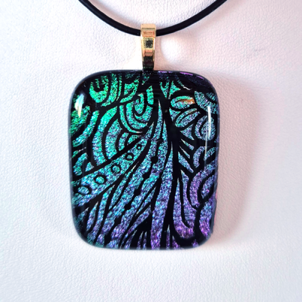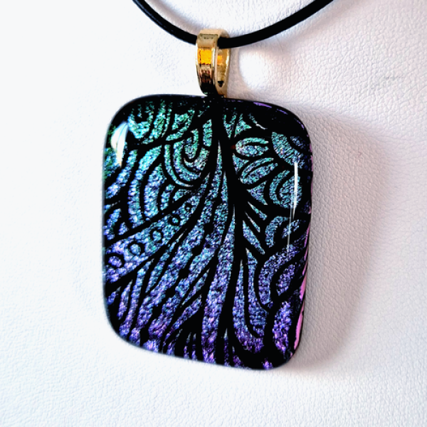 Glittrande smycke med etsat dichroic glas som glasfusats med en svart bas. Smycket har färger i blå-grönt och lila. Det har en storlek av ca 4,2 x 3,5 cm och ett limmat guldpläterat hänge samt ett justerbart läderband med löpknut. Frakt adderas i kassan. Läs mer om leveranskostnader