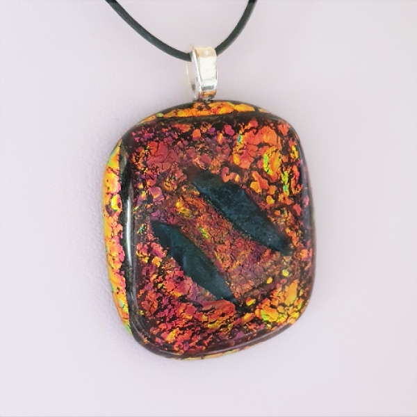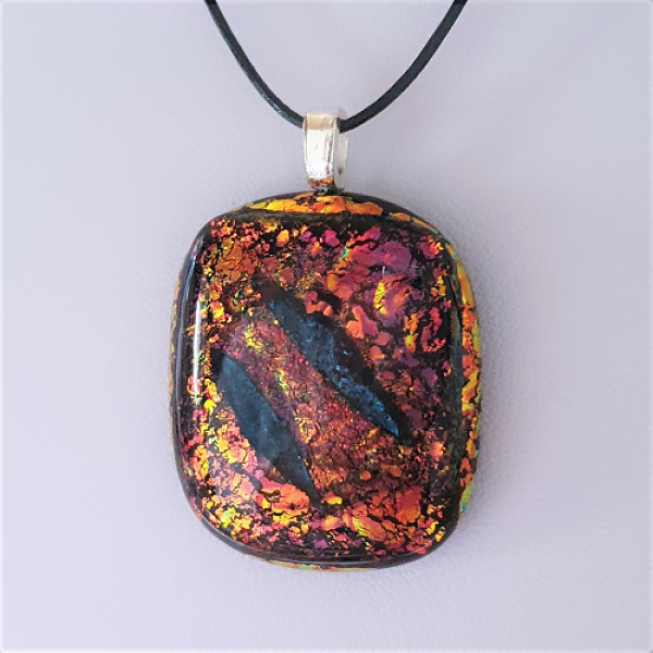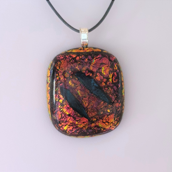 Glittrande smycke med dichroic glas som glasfusats i roströd med en dekoration i mitten som har en svart-blå färg. Smycket har en storlek av ca 3,5 x 2,8 cm och ett limmat silverpläterat hänge samt ett 50 cm läderband med smyckeslås i silver 925. Frakt adderas i kassan. Läs mer om leveranskostnader