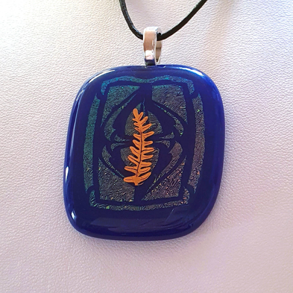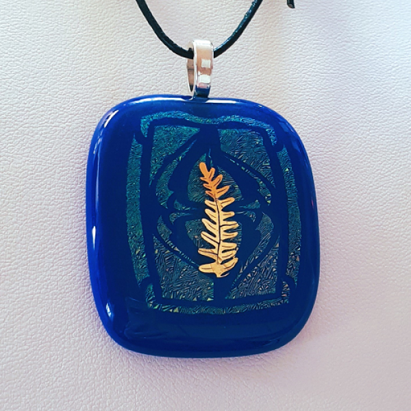 Glittrande smycke som glasfusats tillsammans med en dekorativ metalldekal i guldgult med en bas av dichroic i mönster och blått. Dekalen är en fjäder.  Smycket har en storlek av ca 4,3 x 3,8 cm och ett limmat silverpläterat hänge samt ett justerbart läderband med löpknut.