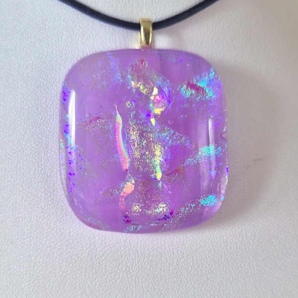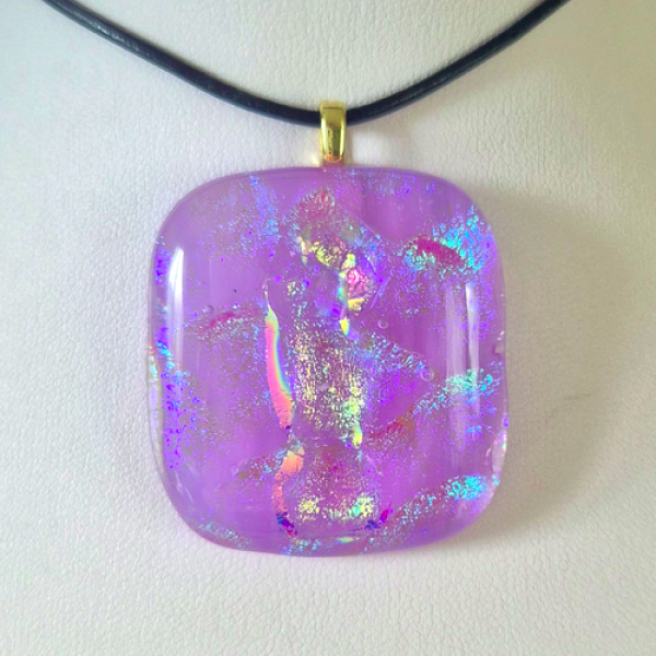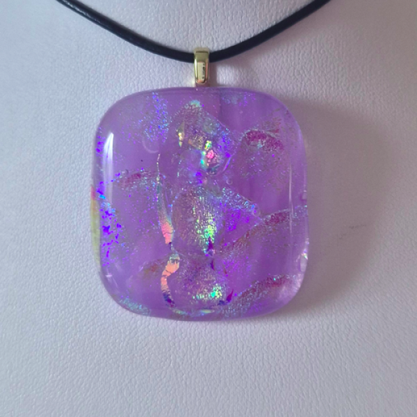 Glittrande smycke med dichroic glas som glasfusats i transparent rosa-lila bas med en ljusare linje vertikalt i mitten av smycket. Smycket har en storlek av ca 3,7 x 3,5 cm och ett limmat guldpläterat hänge samt ett justerbart läderband med löpknut. Frakt adderas i kassan. Läs mer om leveranskostnader