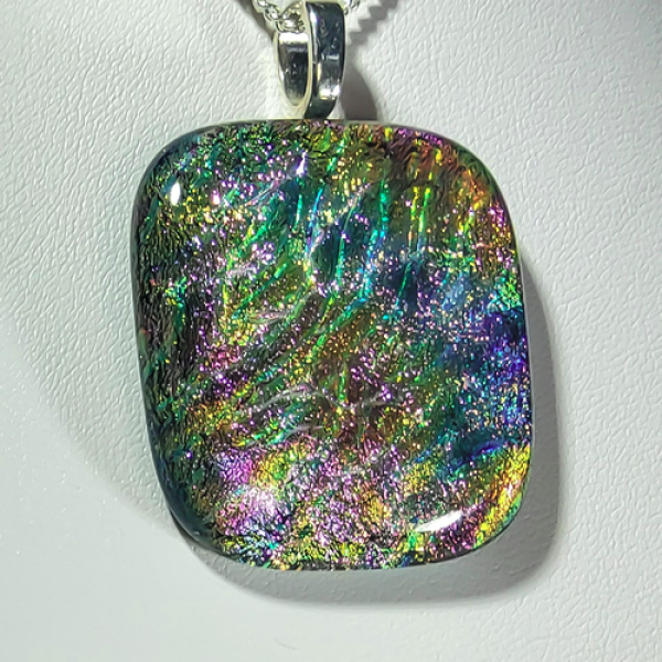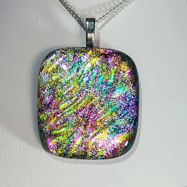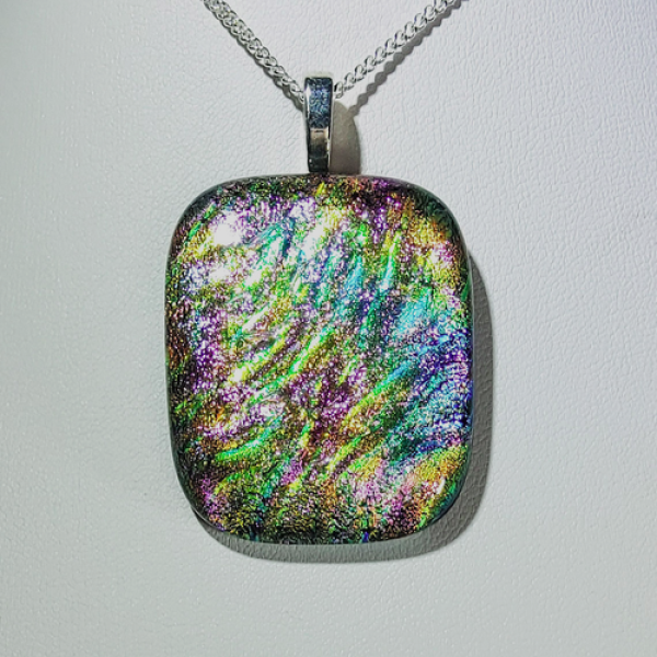 Glittrande smycke med dichroic glas som glasfusats med en svart bakgrund. Smycket som är i flera färger har en limmad silverpläterad hängare och en kedja i Sterling Silver 925. Längden på kedjan är ca 50 cm. Storleken är ca 3,8 x 3,4 cm.