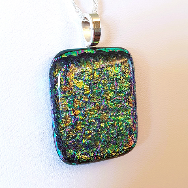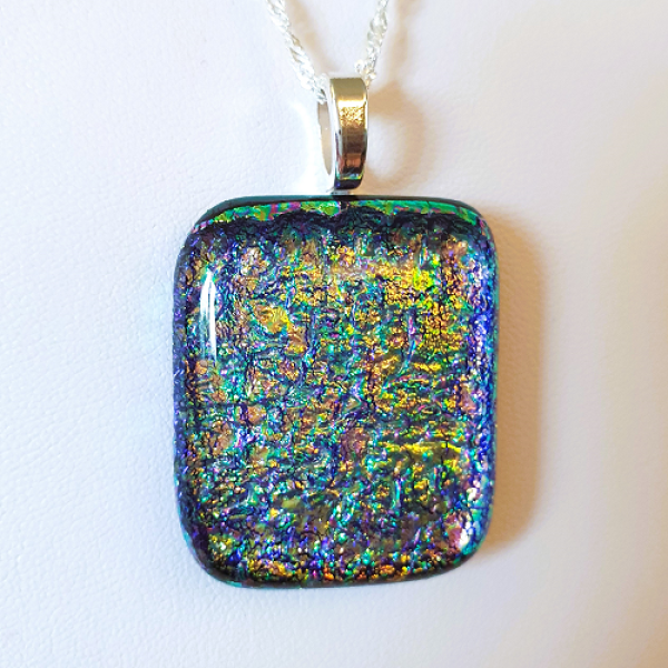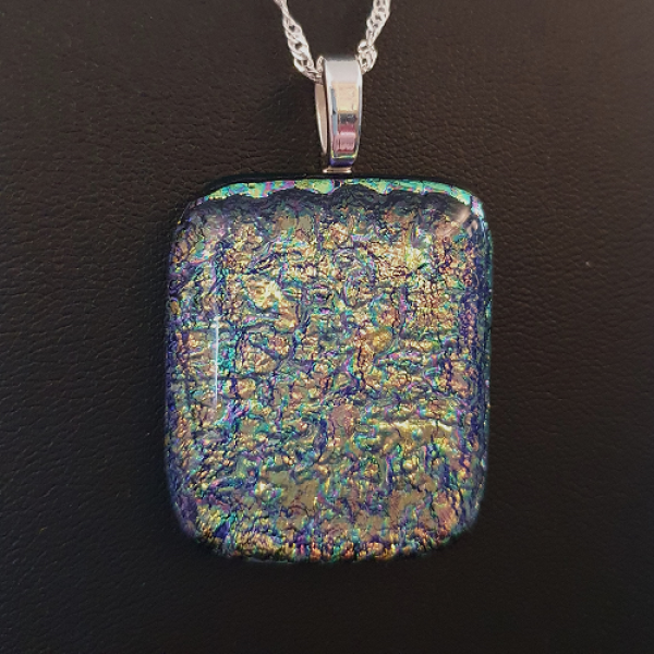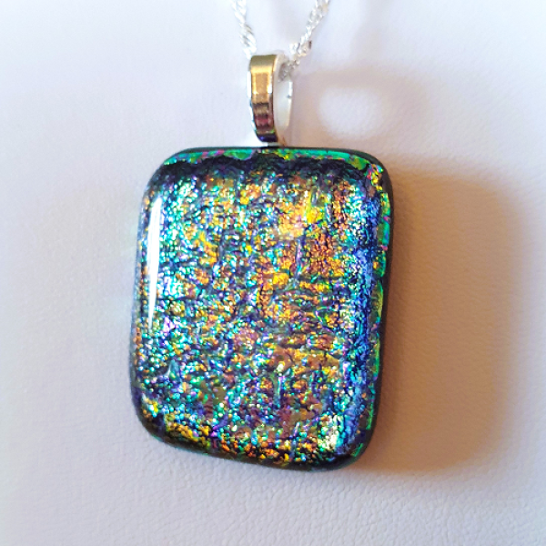 Glittrande glasfusat smycke med dekorativt dichroic glas i flera färger och glasfusing med en svart bas. Smycket har en limmad silverpläterad hängare och en kedja i Sterling Silver 925. Längden på kedjan är ca 50 cm. Storleken är ca 3 x 3,5 cm.