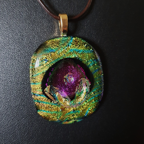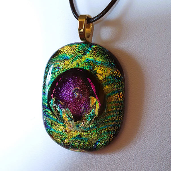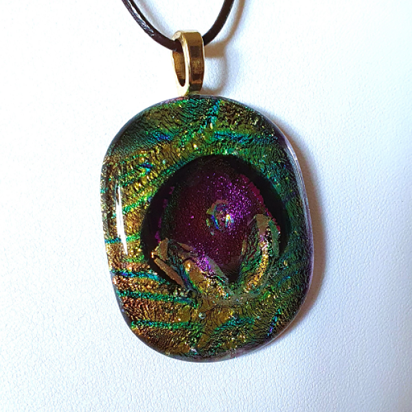 Glittrande vackert glasfusat smycke med dekorativt dichroic glas med svart bas, i grönt med en lila dekoration.  Smycket har en storlek av ca 3,7 x 4,5 cm och ett limmat guldpläterat hänge samt ett justerbart läderband med löpknut.