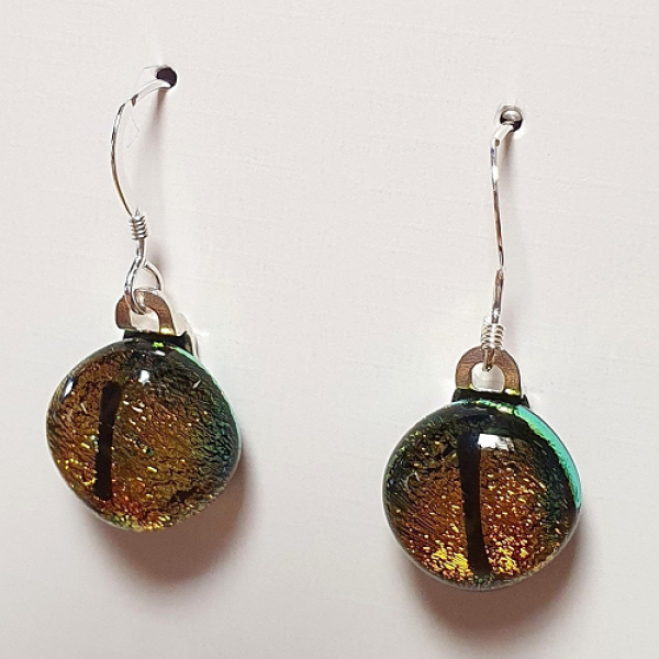 Glittrande glasfusade unika örhängen som glasfusats i svart stringers med en bas av dichroic i amber. De har ett mönster som påminner av ett par kattögon. Upphängningen till glaset är limmad silverpläterad metall och själva hänget till örat är av Sterling silver 925. Frakt adderas i kassan. Läs mer om leveranskostnader