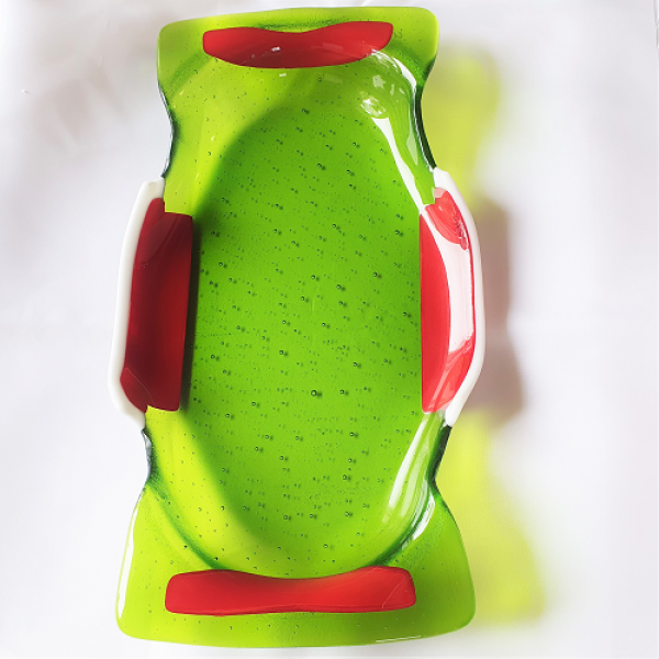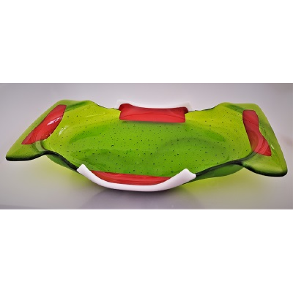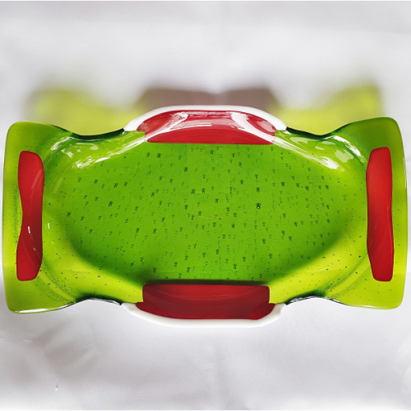 Glasfusat uppläggningsfat i transparent grön med röda och vita kanter. Frakt adderas i kassan. Läs mer om leveranskostnader