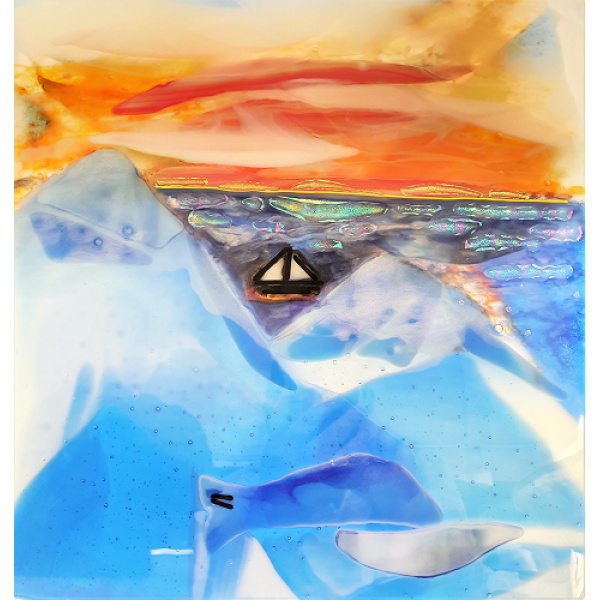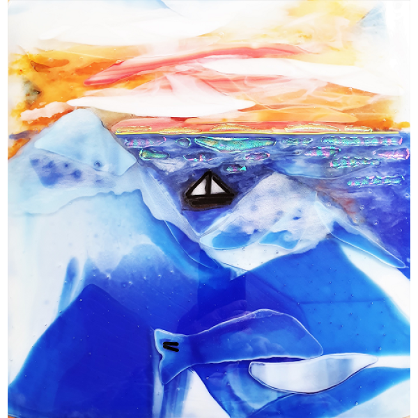 En härlig glastavla med motiv från Nordens hav. Tavlan är glasfusad i specialglas och transparent i en variation av färger, dichroic, stringers och viss glasfärg. Med tavlan kommer också hängare för hörnen för att sättas upp på en vägg. Storleken på tavlan är ca 33 x 33 cm och den har en tjocklek av ca 0,7 cm. Frakt adderas i kassan. Läs mer om leveranskostnader