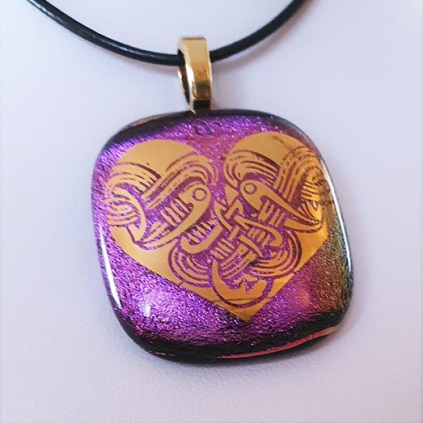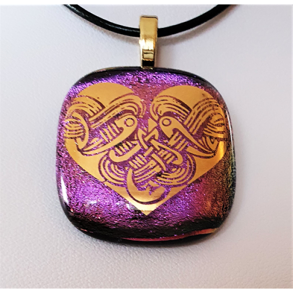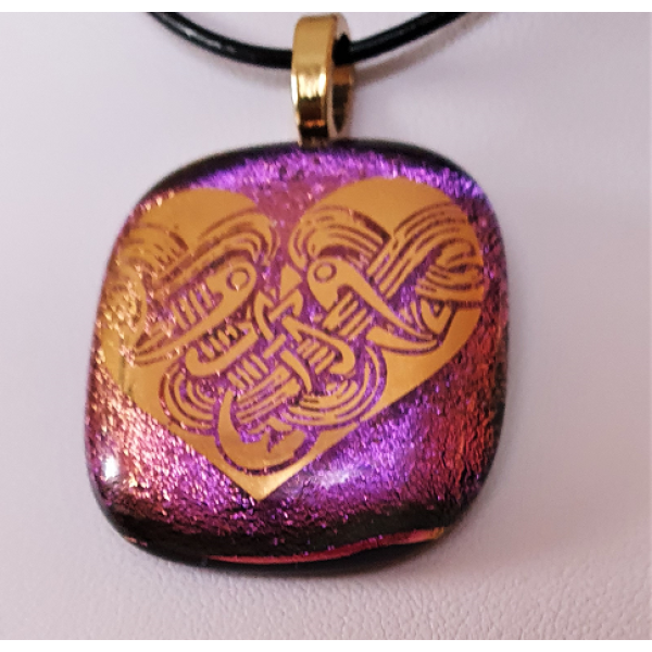 Glasfusat smycke med glittrande dichroic i rosa och en gulddekal med formen av ett hjärta i fusingen. Smycket har ett limmat guldpläterat hänge och ett justerbart läderband med löpknut. Storleken på smycket är ca 3 x 3 cm