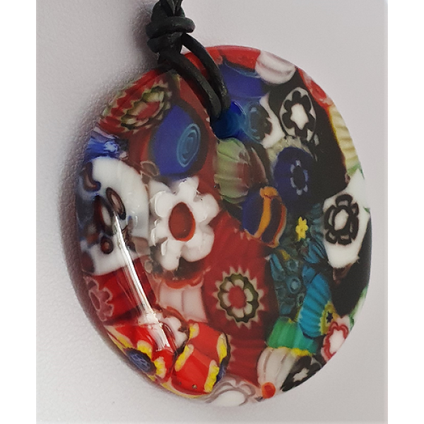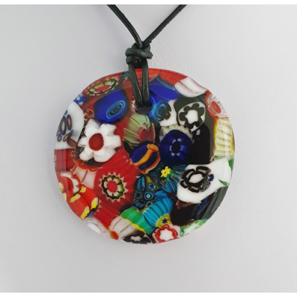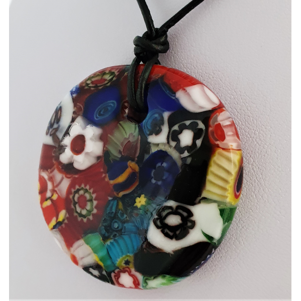 Ett vackert glasfusat smycke av millifiori i många färger i mönster av blommor. Ett justerbart läderband med löpknut följer med. Diametern på smycket är ca 5 cm.